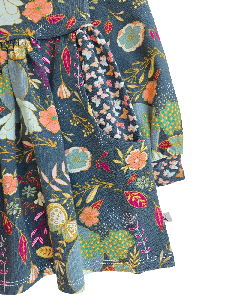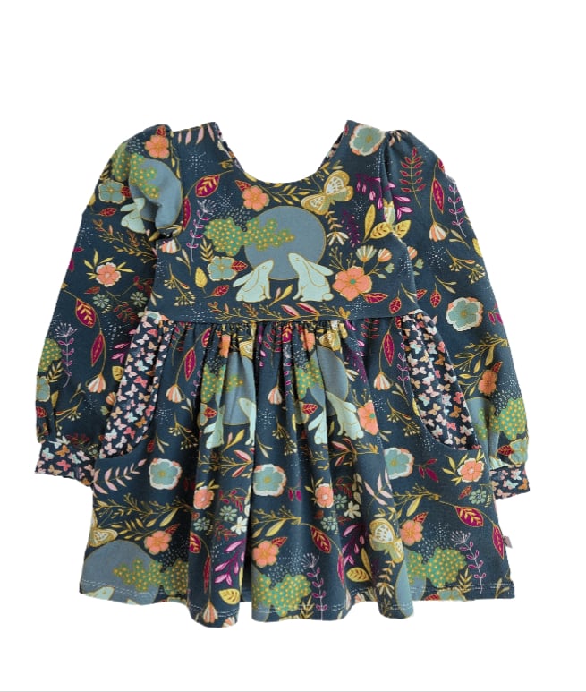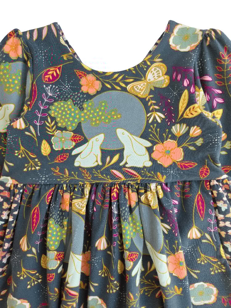 This dress features so many charming details perfect for the little magical one in your life. She can carry her tiny treasures in the welt pockets- perfect for casting spells! The sweet bunnies admire the full moon while tiny moths flit about in the linings and pockets.